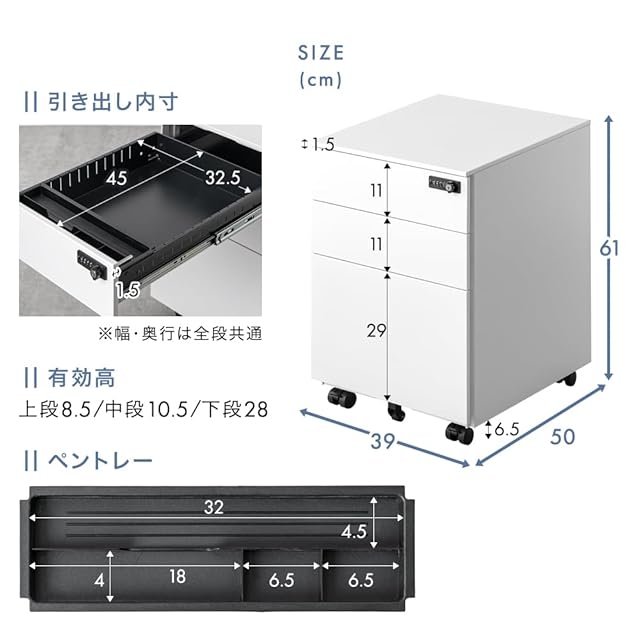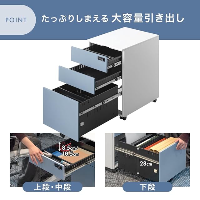 【スタッフのおすすめポイント】 ・カギ不要のダイヤルロック式・一箇所ロックで全ての引き出しを施錠可能・全段フルオープンスライドレール・A4ファイルも収納OK・頑丈&傷がつきにくいスチール製・前倒れ防止の補助キャスター・ペントレー&仕切り付き・キャスター取り付け不要!届いてすぐ使える完成品