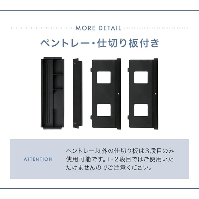 【備考】完成品 ※商品ページの色味は、出来る限り実物に近い色で画像を掲載しておりますが、お使いのブラウザー及びモニターや使用環境により、実際の色と多少の差異があります。予めご了承ください。※ペントレー以外の仕切り板は3段目のみ使用可能です。1/2段目ではご使用いただけませんのでご注意ください。