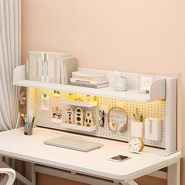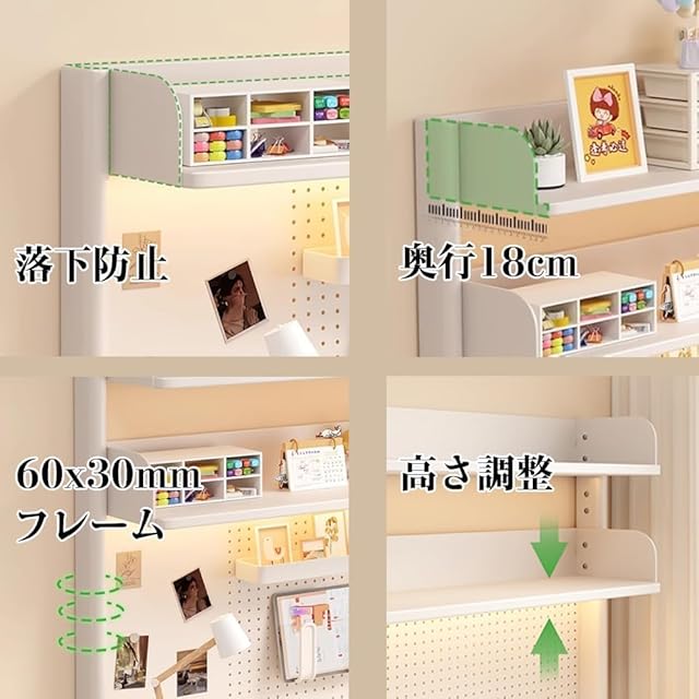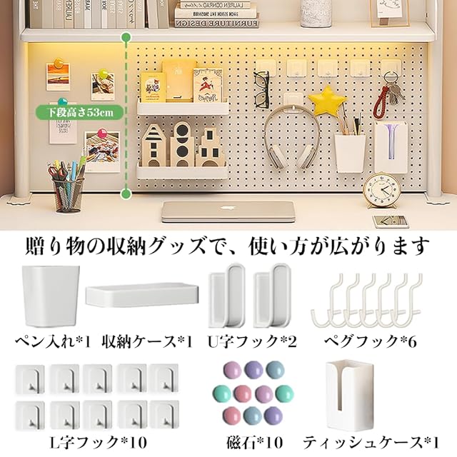 3.【効率的にスペース活用】 有孔ボードが机上シェルフに付いております。イヤホンや鍵などの小物を垂直面に収納することで、デスク周りがすっきりと片付き、作業スペースをより広く使えるようになります。 【贈り物】便利収納グッズをお贈り致します:ペン入れ1個、ティッシュ箱1個、ボックス1個、U字フック2個、L字フック10個、ペッグフック6個と磁石10個。レイアウトを自由に配置でき、アイテム次第で使い方が広がります。
