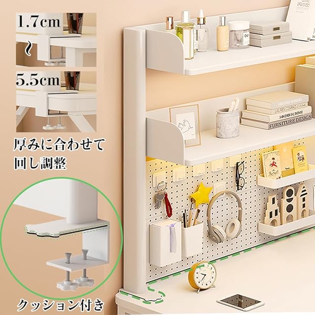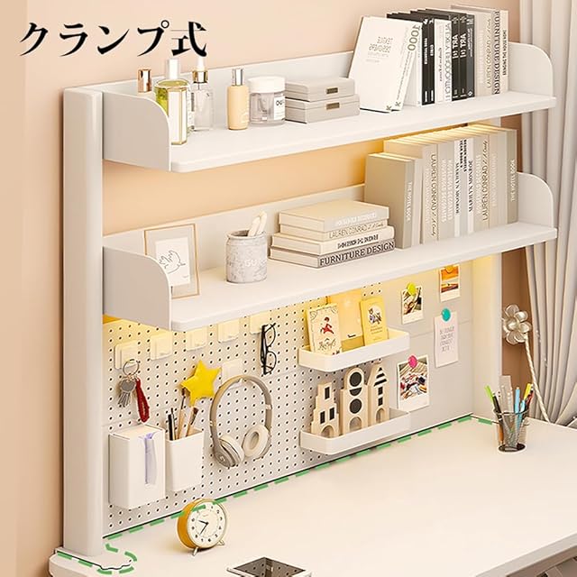 PFLife 机上ラック 有孔ボード付き 卓上ラック クランプ式 スタンド式 デスク上収納ラック ペグボードつき デスクシェルフ デスク上置棚 多機能 小物入れ 白 オーク 二段/三段 簡単組立 スペース活用 可愛いい おしゃれ (クランプ式-ホワイト, 1段-高さ38幅80cm)