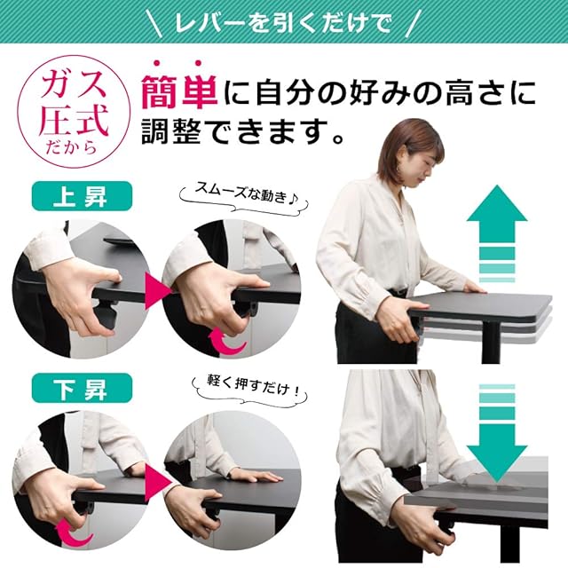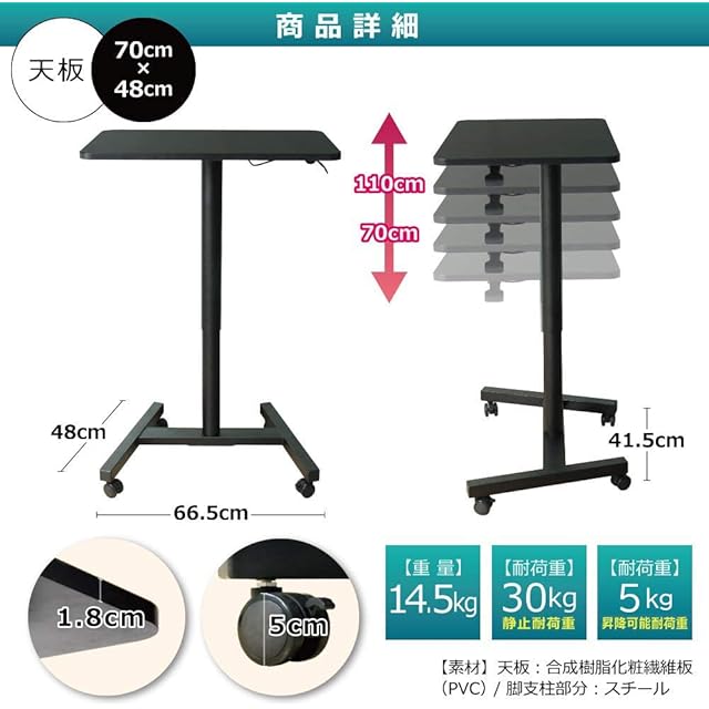 ✅【商品仕様】サイズ:幅70cm × 奥行48cm / 昇降稼働高さ:70cm 〜 110cm / 天板:合成樹脂化粧繊維板(PVC) / 脚支柱部分:スチール 【重量】約14.5kg 【耐荷重】静止耐荷重:30kg / 昇降可能耐荷重:5kg ※本製品はお客様ご自身での組み立てをお願いしております。組み立ての際は、必ず同封の取扱説明書をご覧いただき、記載されている手順に従って組み立ててください。※本製品はガス圧式でオイルは使用していませんが、配送などの過程で潤滑成分がにじみ出ることがあります。これは不具合ではないため、拭き取ってご使用ください。