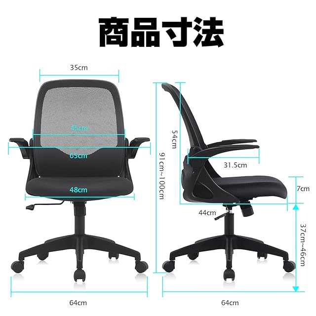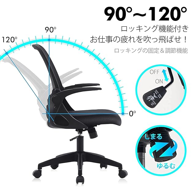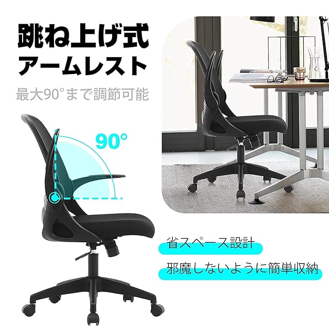 【跳ね上げ式アームレスト】最大90度まで調節できる便利なデザインです。座るときにユーザ次第、アームレストを上げたり下げたりもOK。使わないときにも邪魔しなく更に省スペースでしょう。