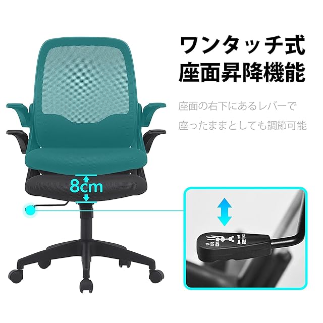 【ワンタッチ式昇降機能】簡単に操作可能です。座面右下のレバーをプルアップすると昇降機能がONになる。色々なシーンに適して、もっと使いやすい環境を作ります。
