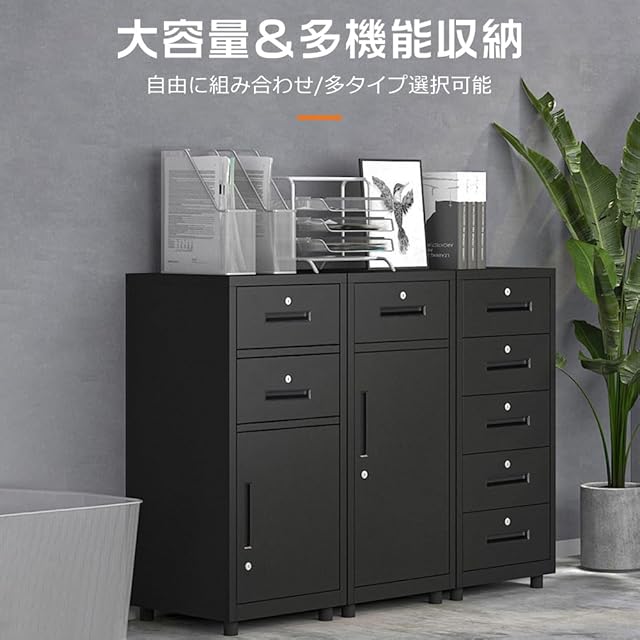 Jiza オフィスキャビネット スチール書庫 鍵付き 引き出し 扉付き 大容量収納 頑固 完成品 (1段引き出し 高さ650MM, ブラック)
