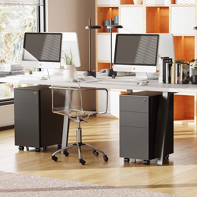 DEVAISE スリムワゴン デスクワゴン サイドワゴン オフィスワゴン キャビネット 幅300*奥行435*高さ600mm スリム型 コンパクトサイズ キャスター付き 鍵付き 3段オールロック A4対応 丈夫なスチール製 サビ止め塗装 ブラック
