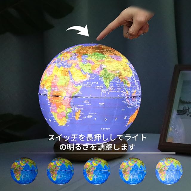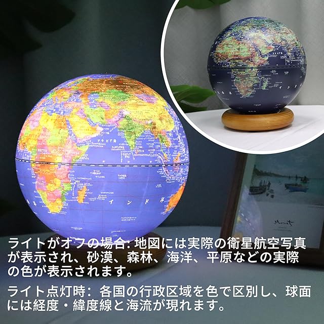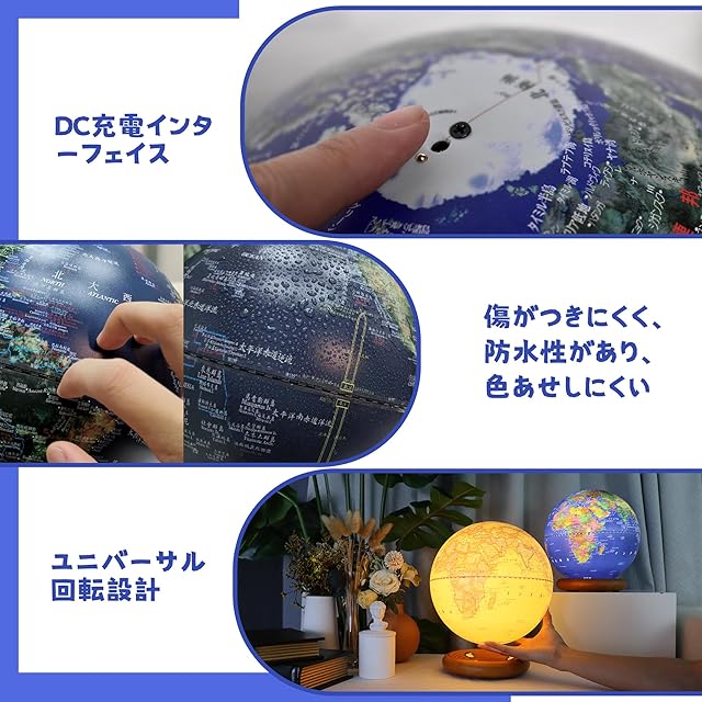 【最新機能:タッチスイッチ&LEDライト付き】充電式タッチライトにアップグレード。黄色い小さなセンサー部分に触れると内部LEDライトが点灯し、あたたかい雰囲気を演出します。 内部LEDライトは本来、地球儀の内容閲読用ですが、光が柔らかく、ナイトライトとしても使用可能。タッチセンサーを長押しすることで明るさ調節も可能です。 緯線、経線、海洋、海流、国、地域なども色鮮やかに認識でき、消灯するとありのままの地球を感じることが出来ます。