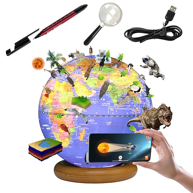 【最新機能:3Dで学べる&AR十二大モジュール】FUN GLOBE地球儀は最先端のAR技術を使用。スマホ等に専用アプリをインストールし、カメラで地球儀をスキャンすると様々な3Dアニメーションが現れる3D知育地球儀です。お家にいながら世界中の文化、建物、動物、星座、天気予報など、12のジャンルを日本語吹き替え解説でお楽しみいただけます。歴史物語などもあり、こども、友人やご家族と学習することが可能な新しいしゃべる地球儀。世界の知識を3Dと音声でお楽しみください。