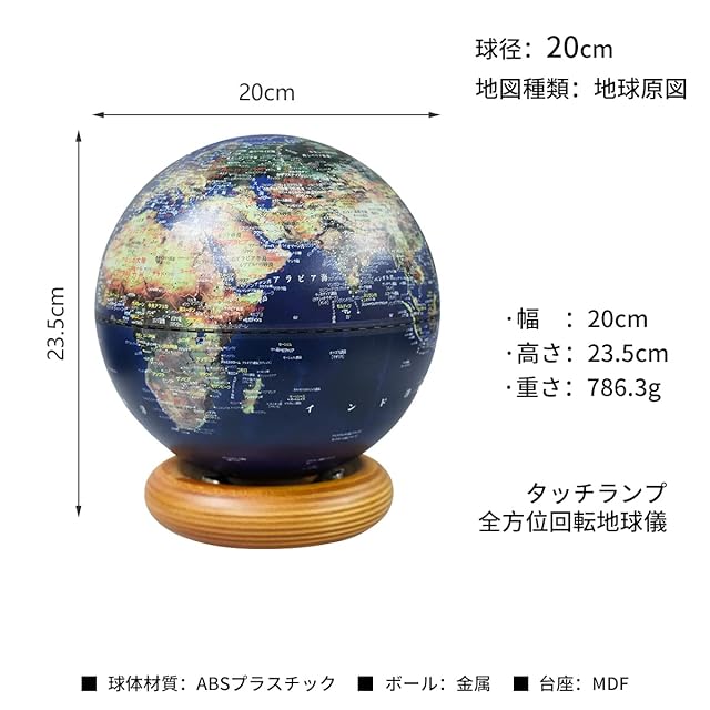 【商品仕様】地球儀サイズ:約20*20*23.5cm 球径:20cm 包装重量:約0.786kg セット内容:地球儀* 1、ルーペ* 1、日本語説明書* 1、USBケーブル* 1、 色:blue。球体は高品質なABS製。環境にやさしく、人体にも無害なしゃべる地球儀です。木製台座で色合いもあたたかく自然な仕上がり。年月が経過しても良い雰囲気を醸し出します。球体表面は真珠フィルムで覆われてい るため文字が見やすく、防水性、耐傷性、耐変色性に優れています。
