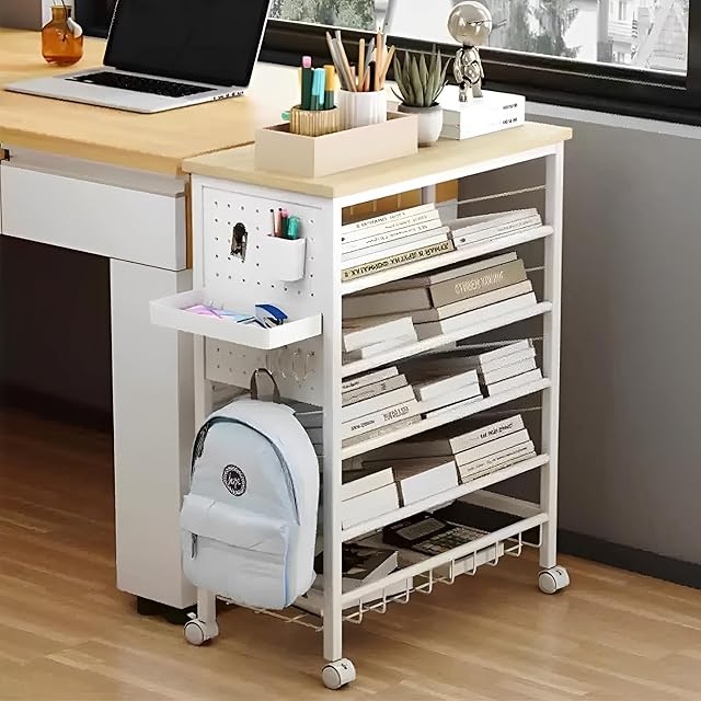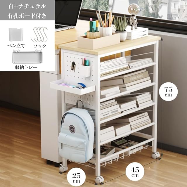 Hoshinoi マガジンラック ファイルワゴン 6段 大容量 キャスター 有孔ボード付き 袖机 デスクサイド収納ワゴン ラック スリム 幅45×奥行25×高さ75cm 天板付き オフィス リビング 雑誌収納 組立簡単 頑丈 おしゃれ 斜め 机下 デスク下 移動便利 (ナチュラル(有孔ボード付き), 6段)