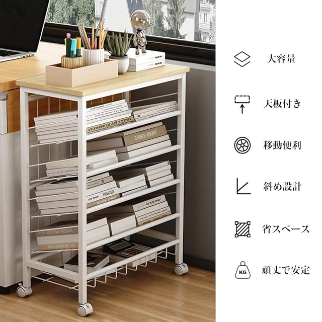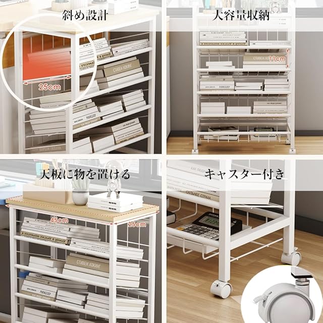 「省スペースなデスクサイドラック」 サイズは45×25×75cmで、設置面積はわずか0.1㎡未満。コンパクトな設計ながら、高さもデスクにぴったりフィットし、デスクサイドに置くことで、本や雑誌、資料をすっきり整理でき、作業スペースを無駄なく活用できます。