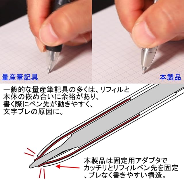 ぺンジャケットの中には部品が1つだけ。固定⽤のアダプタにペン先が装着できてカッチリとリフィルを固定、ボディ内にリフィルが収まりブレを無くし、思った通りに書きやすくします。