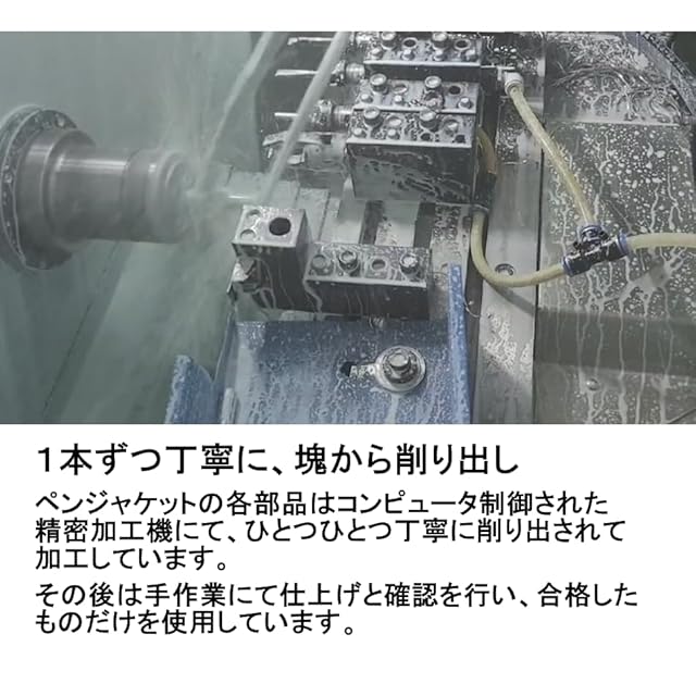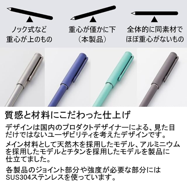 メインの材料としてA6063アルミニウム合金製、チタニウム合金製をご用意、ジョイント部分や強度が必要な部分にはSUS304ステンレスを使っています。ステンレスは削り出しのボディで、書きやすさの向上に寄与いたします。