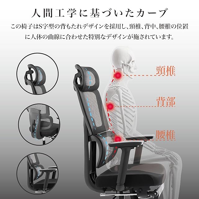 このオフィスチェアは、S字型の背もたれを採用しており、頸椎、背中、腰椎の位置に合わせて設計されています。長時間の作業でも体への負担を軽減し、快適な座り心地を提供します。