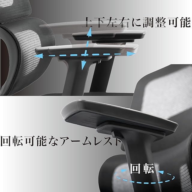 アームレストは上下左右の調整が可能で、さらに回転機能も搭載。腕をしっかりサポートし、肩や手首の疲れを軽減します。自分の理想のポジションに合わせて調整できます。