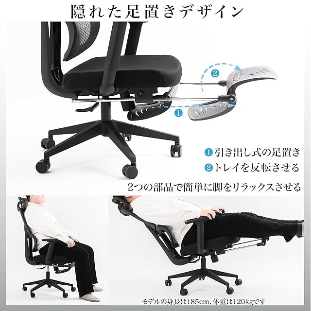 このチェアには隠れた引き出し式の足置きが搭載されており、簡単に引き出してリラックスすることができます。足をのばして、仕事の合間にゆったりとくつろぐことができ、長時間の座り仕事も楽に感じられます。