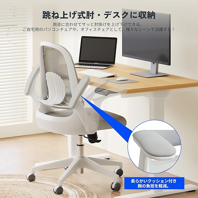 【肘跳ね上げ式オフィスチェア】椅子に座るときには肘を下ろして使用でき、椅子に座らないときには肘を跳ね上げてデスクに収納できる。また、用途に合わせてサッと肘掛けを上げ下げできる。ご自宅用のパソコンチェアや、オフィスチェアとして、様々なシーンで活躍する!