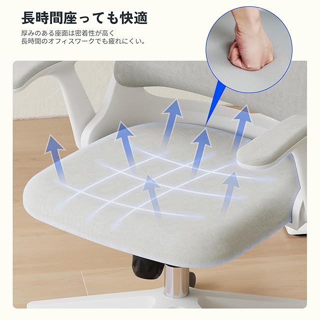 【長時間座っても快適】背もたれには通気性に優れたメッシュ素材を採用。厚みのある座面は密着性が高く長時間のオフィスワークでも疲れにくい。