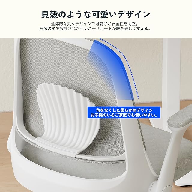 【貝殻のような可愛いデザイン】全体的な丸々デザインで可愛さと安全性を両立。貝殻の形で設計されたランバーサポートが腰を優しく支える。角をなくした柔らかなデザインは、お子様のいるご家庭でも使いやすい。