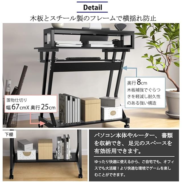 【散らかったデスク周りをすっきり整理収納!】★上棚:机上台を使用することで、事務スペースを簡単に確保できます。モニターの位置が高くなることで視線が上がり、自然に背筋が伸びるようになります。★下棚:パソコン本体やルーター、書類を収納でき、足元のスペースを有効活用できます。★キーボードスライダー:キーボードや小物を置けます。スリムなのに収納力が抜群で場所が取らないです。ちょっとしたスペースがパソコンコーナーに早変わり、作業効率がぐんぐん上がります。ご自宅ではもちろん、オフィスでも大活躍!