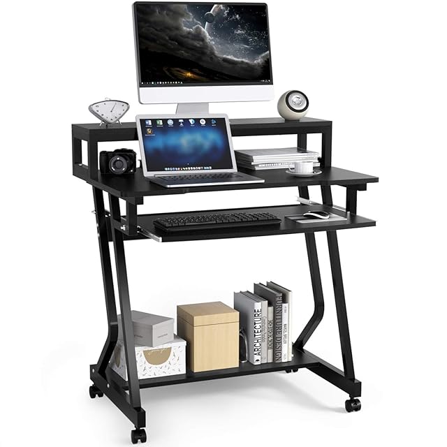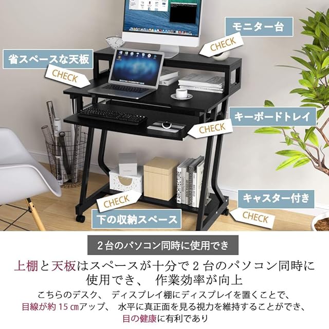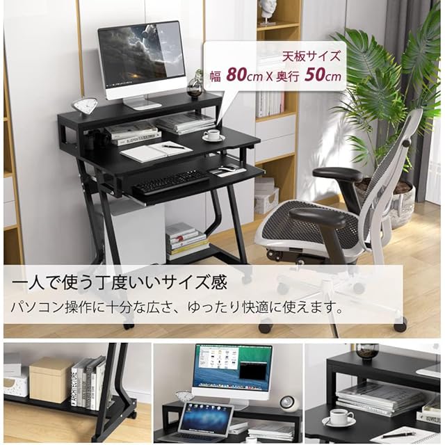 パソコンデスク テレワーク用 幅80cm DEWEL pcデスク キーボードテーブル付き モニタースタンド付き 収納つきデスク キャスター 上棚付き 棚付き 勉強デスク 机 勉強机 木製 シンプル 木目柄 メラミン加工 省スペース ワークデスク学習机 オフィスデスク ブラック 80X50X90cm