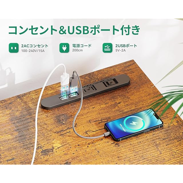 【USBポートコンセント付き-充実なサポート機能】デスク天板の上にコンセント口2口とUSBの差し込み口2口を備え、パソコンの電源やスマートフォンの充電などを手近なところで取ることができるので便利です。コンセントの差し込み口があるのでコードを伸ばすことなく電源が取れ、電池残量を気にせずに長時間の作業も可能です。