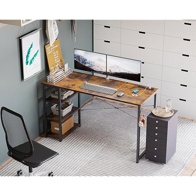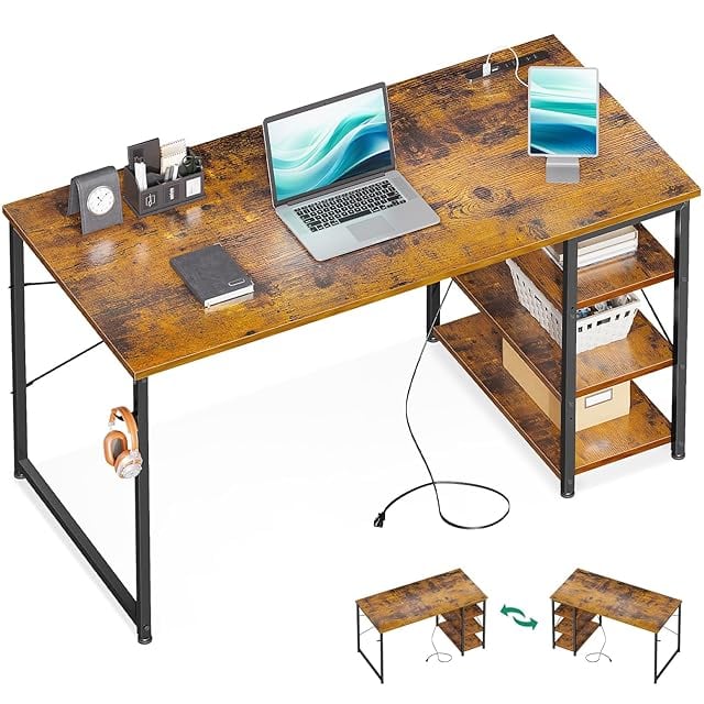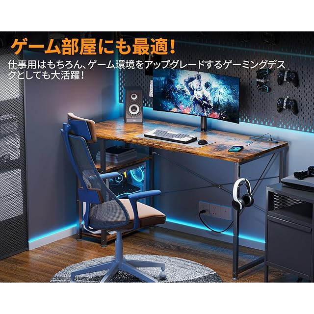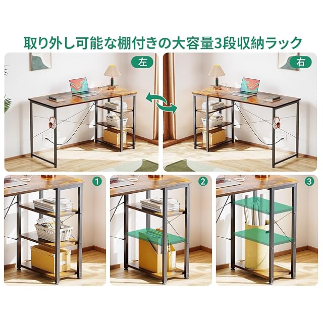 KKL デスク 机 pcデスク 幅120cm コンセント付き 3段ラック付き 収納フック付き 左右入替え対応 パソコンデスク ゲーミングデスク ワークデスク 在宅勤務 桌子 勉強机 学習机 おしゃれ シンプル 組立簡単 ビンテージ