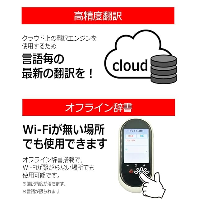 高精細 翻訳エンジン クラウド翻訳 により、日常会話の一言くらいなら 最速 で 0.2秒 と 従来の翻訳機 より より早く 精度の高い翻訳結果を実現