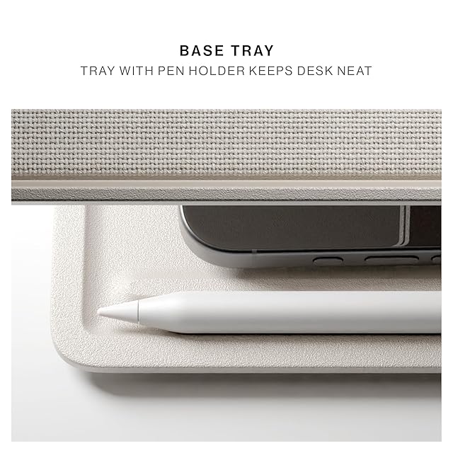 モダンデザイン: マットな金属仕上げとファブリック表面で、あなたのスペースを引き立てるデザイン。ペンホルダー付きのベーストレイは、小物を整理してデスクをきちんと保つための専用スペースとして機能します。