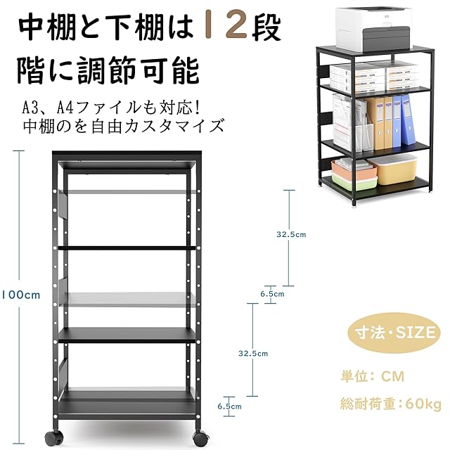 DEWEL プリンター台 耐荷重80kg 4段 プリンターラック 幅60×奥行50×高さ97-100cm サイドテーブル キャスター付き A3ファイル対応 中棚調整可能 ジャスター付き デスクワゴン 頑丈 木製 袖机 ブラック