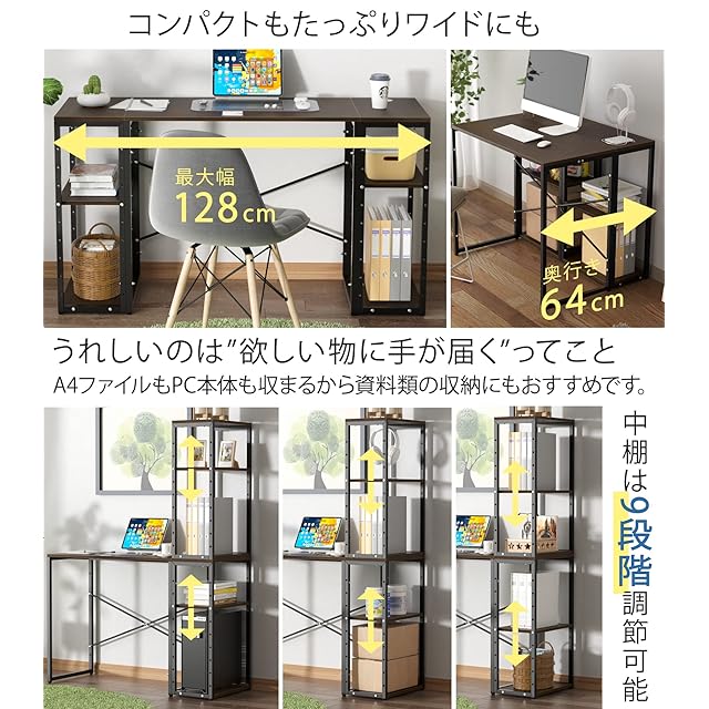 【シェルフ付きデスク】ラックが連結しているから、席を立たずとも欲しい物に手が届き、物を探す手間が省けて格段に作業効率が上がります。ラックの中段棚板はそれぞれ9段階で高さ調節ができる可動棚を採用。収納物に合わせて調節が出来ます。A4ファイルも収まるから、資料類の収納にもお勧めですよ。