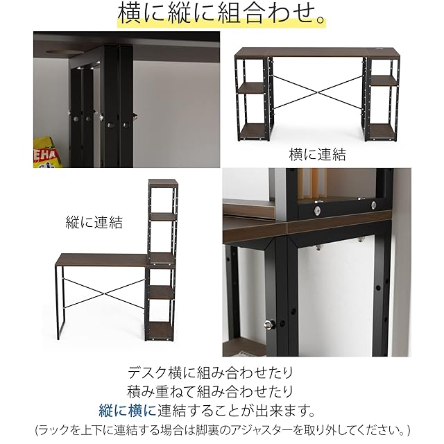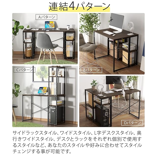 【3点セット&連結4パターン】組合わせて形が変わるラック付きデザインデスクです。デスク横にラックを組み合わせたり、積み重ねたり、縦に横に連結することが可能です。サイドラックスタイル、ワイドスタイル、L字デスクスタイル、奥行きワイドスタイル、デスクとラックをそれぞれ個別で使用するスタイルなど、あなたのスタイルや好みに合わせてスタイルチェンジする事が可能です。