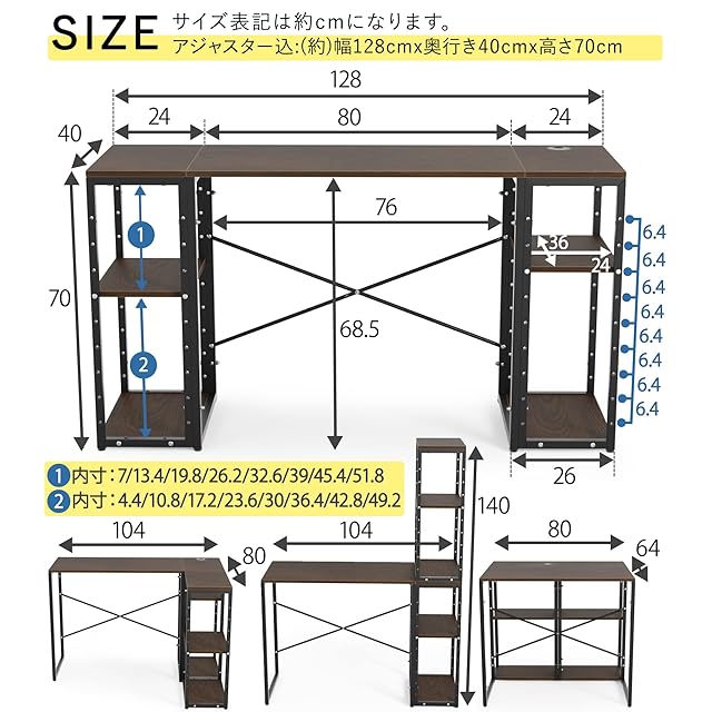 【総耐荷重:約160kg】デスク天板:約40kg シェルフ天板:約20kg*2 シェルフ可動棚:約20kg*4【材質】パーチクルボード 板厚約1.5cm 天板は最強グレードのメラミンで仕上げています。【メラミン加エ】天板には強度最強クラスのメラミン加エ水も弾き、汚れにも強いメラミン加工を施した天板は程よく光沢があり高級感を醸し出します。また、非常に強いガムテープの粘着力にも負けないくらいの丈夫さです。