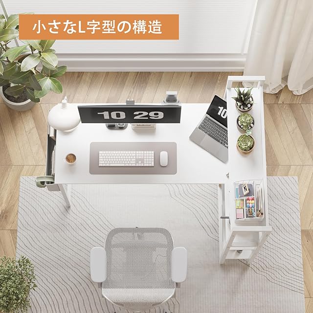 豊富な収納オプション:デスクには4段の棚とサイド収納バッグが付属しており、必需品を整理して手の届くところに保管できる多様な収納オプションを提供します。棚には本、書類、事務用品、装飾品などを収納でき、サイド収納バッグは雑誌、ノート、小型電子機器の収納に最適です。