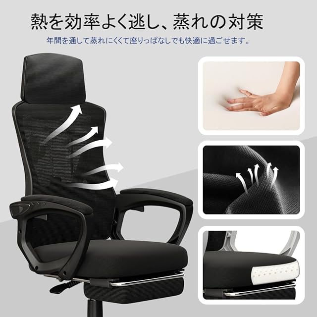 【一年中快適・フルメッシュ】オフィスチェアの座面は柔らかで高密度なウレタン生地を採用し、耐久性が優れるだけではなく、リラックス効果が抜群で、長時間座っても快適な座り心地を楽しみます。座面表面と背もたれは弾力性・通気性に優れるメッシュで、蒸れをうまく逃がしてくれて、さらに脱落や変形しにくいです。
