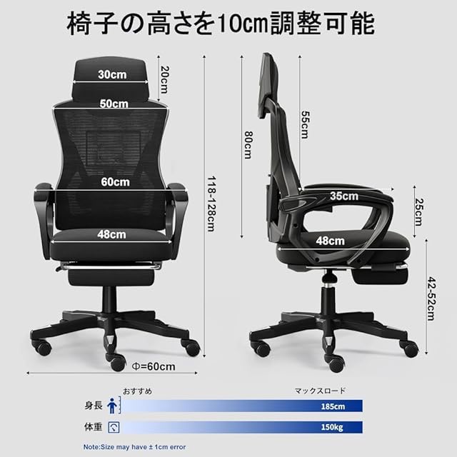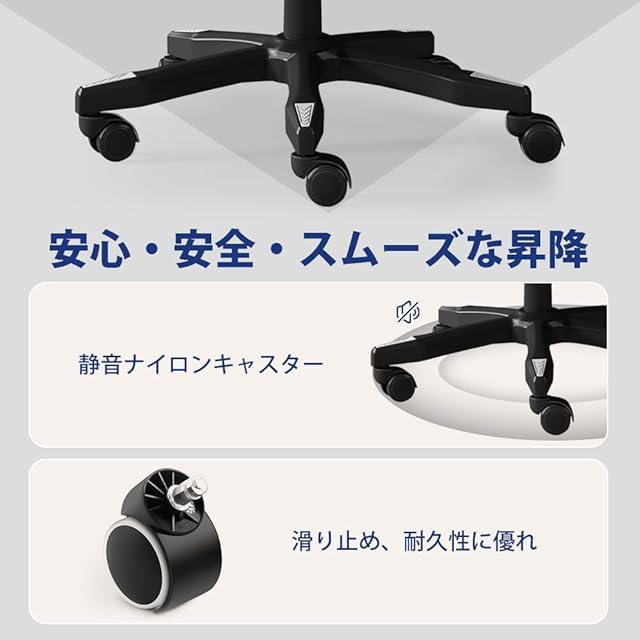 【機能性こだわり・使いやすい】座面の昇降幅は10㎝まで可能となり、身長やデスクの高さに合わせて自分の好み高さを調整するこどができます。SGS認証のガスシリンダーにより、より安全でより丈夫。オフィスチェアの静音キャスターがPU素材採用して、360°回転可能で、移動しても静かに行っています。