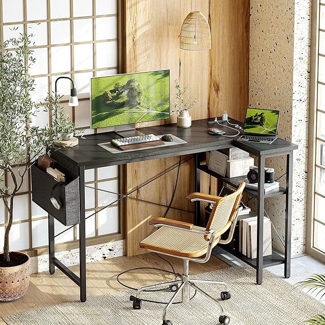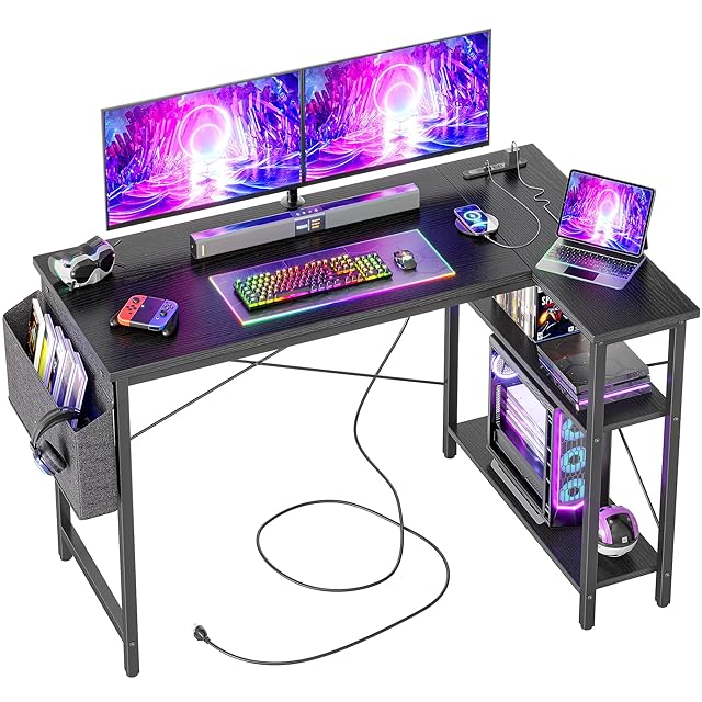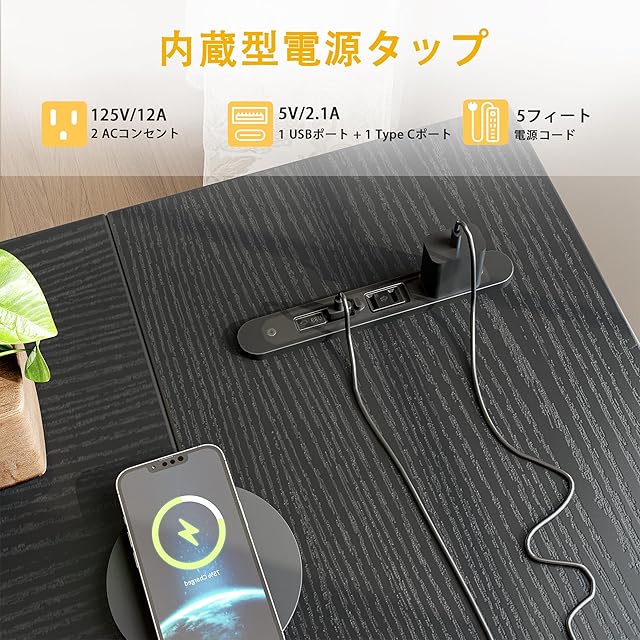 [電源タップ付きコンピューターデスク] L字型デスクは、コンピューター、モニター、さまざまなアイテムを置くのに十分なスペースを提供します。電源タップを内蔵しており、2つのACコンセント、1つのUSBポート、3つのType-Cポートを備えているため、充電が簡単になり、ケーブルの乱雑さを軽減できます。