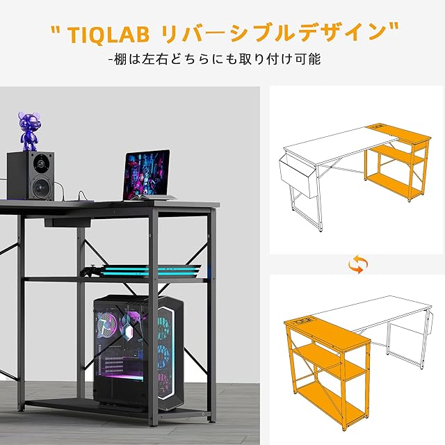 TIQLAB ゲーミングデスク パソコンデスク L字型デスク 幅120x70cm コンセント付き 棚付き コーナーデスク ワークデスク 勉強机 作業机 オフィスデスク 在宅勤務 省スペース ブラック
