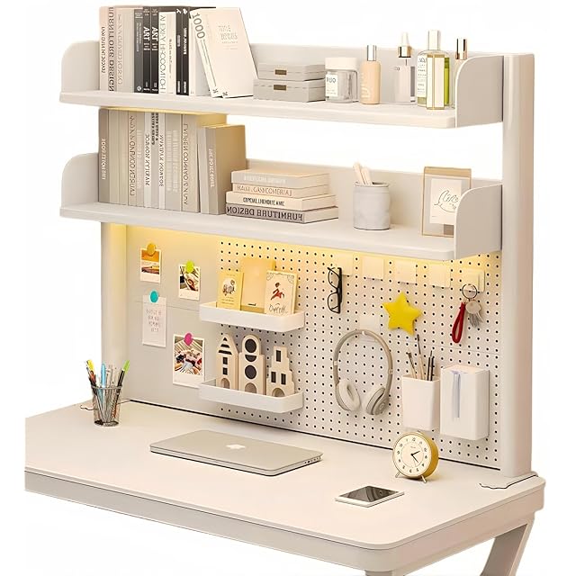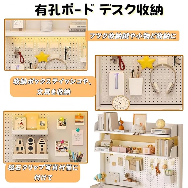 【有孔ボード設計】この机上ラックの大きな特徴は、有孔ボード設計を採用していることです。L字フック、ペンスタンド、ミニコンテナ、マグネットクリップ 、自由に有孔ボードに取り付け出来、何回も変更することができます。