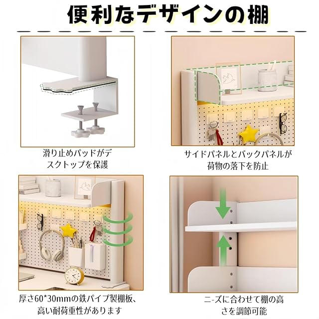 【抜群の収納力】デスク 棚ダブルスクリューで固定し、より強固にします。積層板の高さは調節でき、物品の高さの必要に応じて、容易に拡張することができます。小物類の整理はもちろん、PCモニター収納ラックとしてデスク上の用途も広がります。