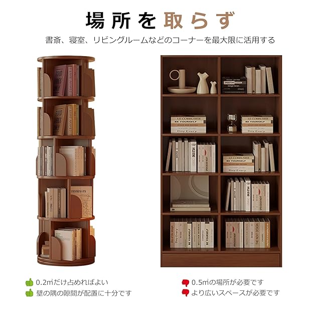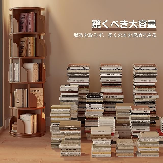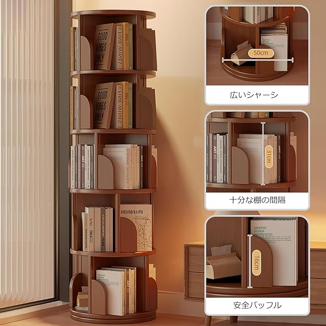 「安定性と耐久性」この回転式本棚は耐久性のあるMDF素材を使用し、しっかりとした安定感を提供します。頑丈な構造で、リビングやオフィスの回転式本棚として、重い本もしっかり支えます。