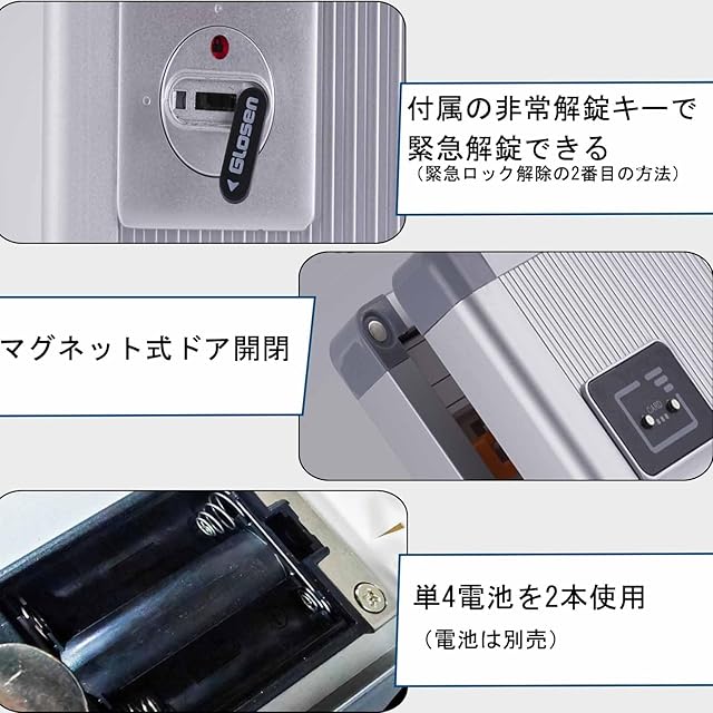 ■電池式。電池残量が非常に少なくなると、開ける時に警告音が鳴り、赤いランプが点滅します。 この時、耐久性のある電池に交換してください。 また、間違ったパスワードや他のカードを4回連続で入力すると、60秒間警告します。電源が完全に切れたり、他の理由で開けできない時、緊急に開錠できます。(電池は含まれない)