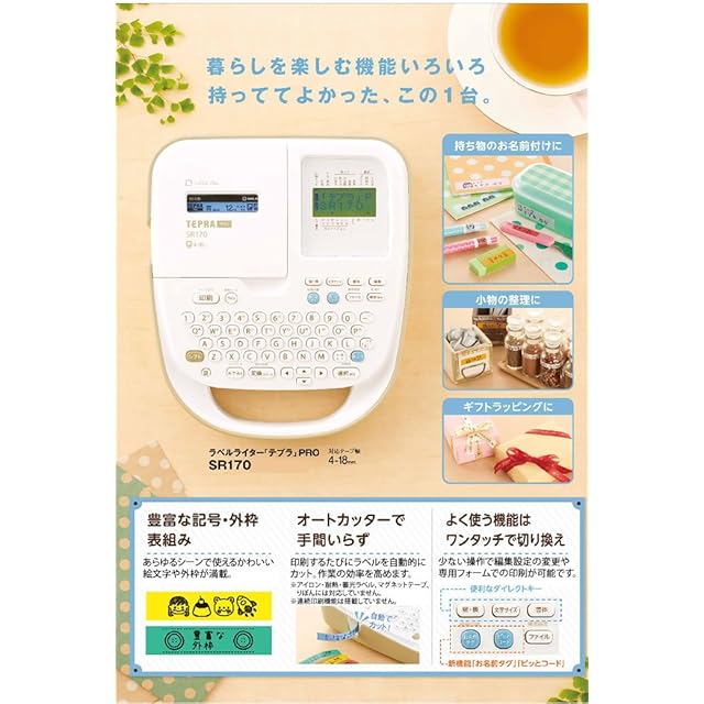 簡単操作で誰でもつかいやすいテプラ ◆豊富な外枠・記号・表組み…あらゆるシーンで使えるかわいい絵文字や外枠が満載 ◆オートカッターで手間いらず…印刷するたびにラベルを自動的にカット ◆よく使う機能はワンタッチで切り替え…少ない操作で編集設定の変更や専用フォームでの印刷が可能です