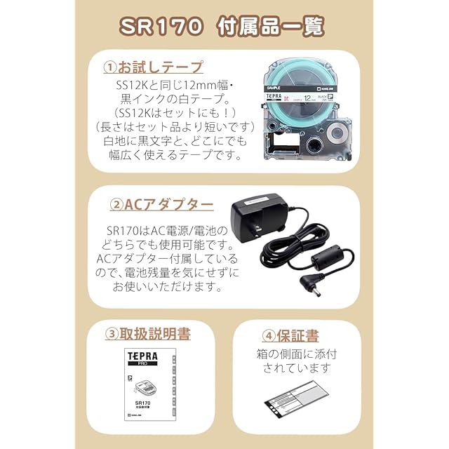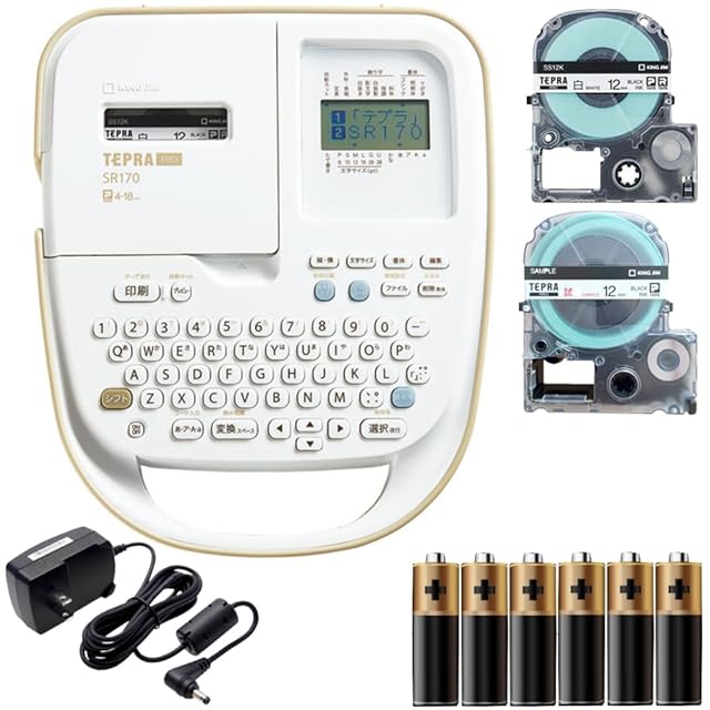 [ラベルライター テプラPRO SR170]、[テープカートリッジ 白ラベル SS12K]、[単3電池 6本]のセット