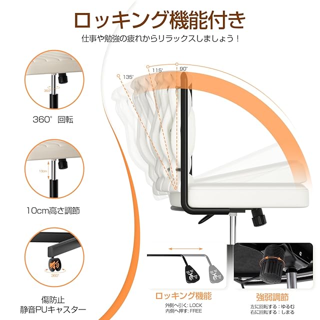 【ロッキング機能&高さ調節&360°回転】90°から135°のロッキング機能が備えています。長時間の勉強や仕事した後ロッキングすれば、硬くなった体を伸ばすことができ、気分転換にもつながります。ゆらゆら揺れる中で、ちよっとした休憩も至福の時間に変わります。座面の下にあるレバーを引くと、上下10CM範囲で簡単に調節可能です。最適な作業姿勢や視線まで調節でき、正しい姿勢を保ち続けます。オフィスチェアの座面もキャスターも360°スムーズに回転し、自由にお好みな方位を向けます。