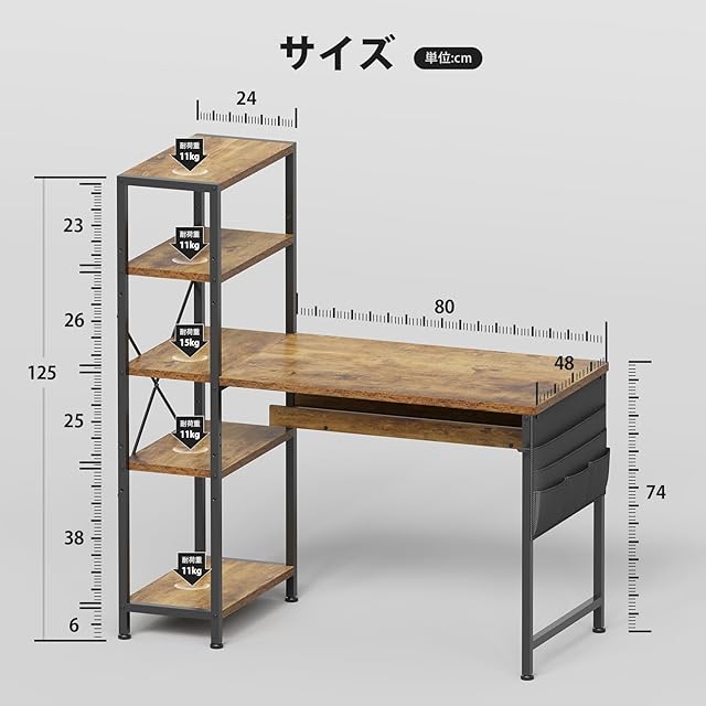【大きな作業と収納スペース】従来の机に比べ、側面上部に層板がついており、プリンターなどの机器を置くことができます。中間層板は調節可能で、A4フォルダに直接入れることができます。ラック付きデスクは丈夫な収納袋とフックが付いておりますので、書類、カバン、ヘッドフォンなどの収納がとても便利になり、天板がすっきり片付けられます。