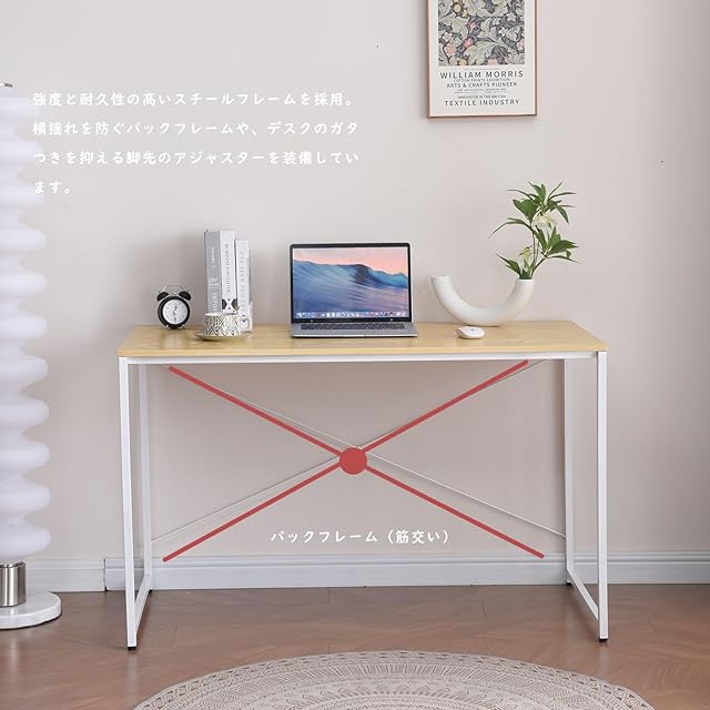 【頑丈設計】耐荷重は50kgで、パソコンや周辺機器をしっかりと支えます。天板裏の補強パイプ、横揺れを防ぐバックフレーム、脚先のアジャスター、強度と耐久性に優れたスチールフレームを採用し、安定感のある使用感を実現しました。