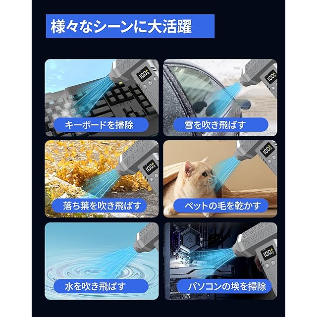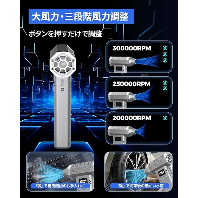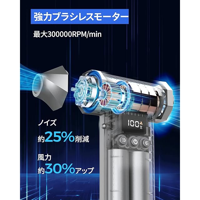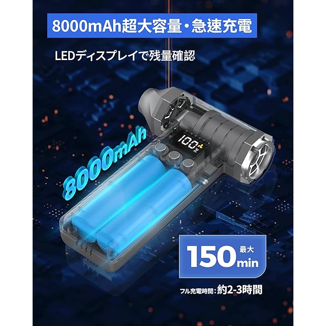 【10000mAh大容量バッテリー&急速充電可能】10000mAhの大容量リチウムバッテリーを内蔵しており、約2-3時間フル充電で最大200分使用可能で、最高回転速度では約10分の強力な暴風を持続し、各種作業の円滑な完了を支えることができます。また、USB-C充電ポートは急速充電に対応しており、高速で効率的な充電が可能です。