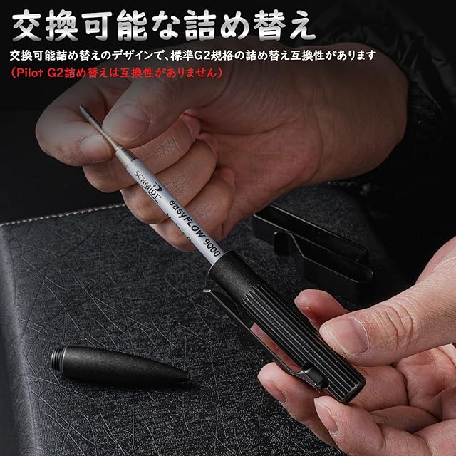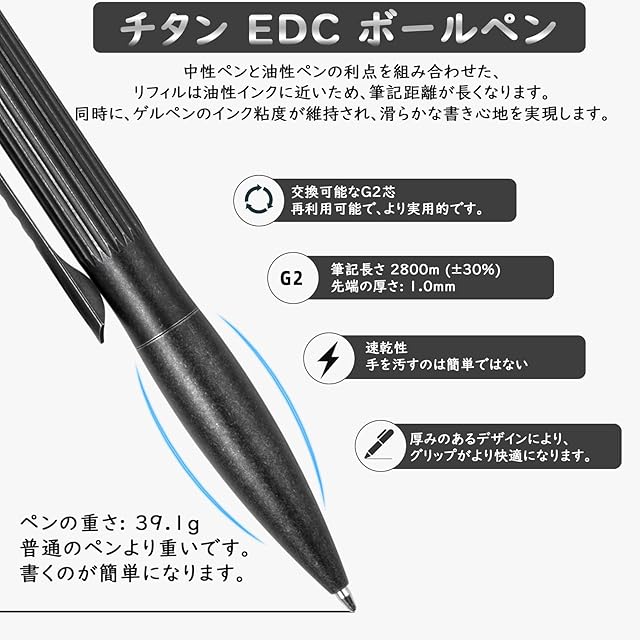 注意:標準G2ペン芯と互換性があります(Pilot G2ペン芯は使用不可。替えのペン芯を購入する際は、正しいサイズに注意してください)。パッケージ内容: チタン ボールペン1本。