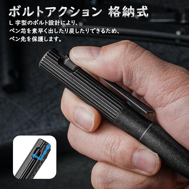 L 字型ボルトアクション機構: 「L 字型」ボルト設計により、リフィルの素早い取り出しと収納が可能になり、ペン先を保護し、ポケット、ラップトップ、バックパックがインクで汚れるのを防ぎます。
