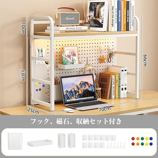 PFLife 卓上ラック 有孔ボード付き 机上シェルフ 机上ラック ペグボード付き 卓上本棚 デスク上置き棚 多機能 小物入れ 白 黒 二段/三段 簡単組立 スペース活用 おしゃれ (ホワイト-ナチュラル, 1段-幅70cm)